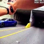 Screengrab of police officer approaching the stolen vehicle – NYPD/Social media X. Cut to the chase. Crazy new NYPD video shows cops hot on the tail of two alleged car thieves in a stolen muscle car. The footage shows cops and two alleged robbers racing through the streets…